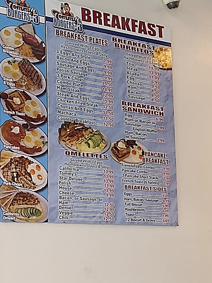 The menu at Tommy's Burgers features a diverse selection of fast food and breakfast items, with a focus on hamburgers and traditional American breakfast offerings. It is suitable for customers looking for quick meals or casual dining throughout the day.